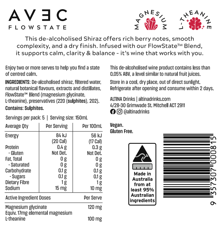 De-Alcoholised Shiraz, natural botanical flavours, extracts and distillates, FLOWSTATE® Blend (magnesium glycinate, L-theanine), preservatives